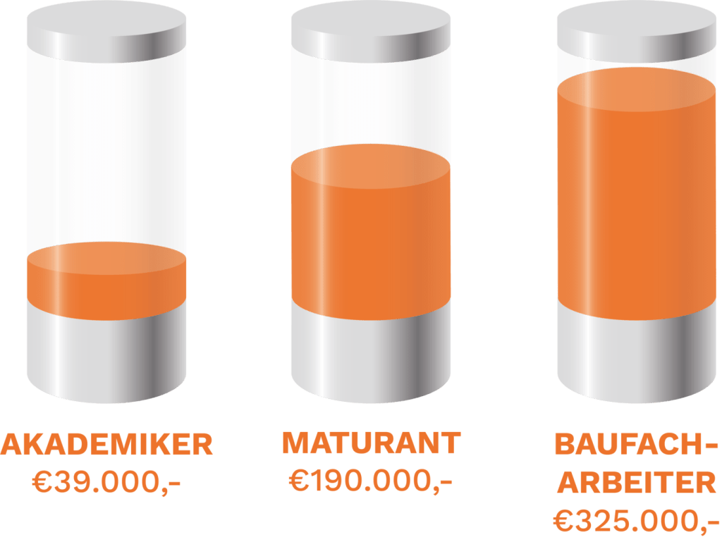 Bau-Facharbeiter haben nach 10 Jahren – verglichen mit Universitätsabsolventen – beim durchschnittlichen Lebensverdienst klar die Nase vorn. Mit 25 Jahren haben sie um rund € 130.000,-* mehr verdient als ein Maturant bzw. um rund € 280.000,-* mehr als ein Akademiker.